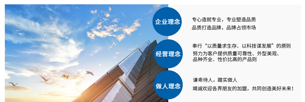 公司本着用户至上的宗旨,奉行“以质量求生存、以科技谋发展”的原则,努力为客户提供质量可靠性、外型美观、品种齐全、性价比高的产品。在此竭诚欢迎各界朋友的加盟,共同创造美好未来!